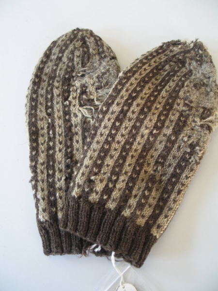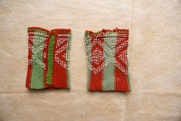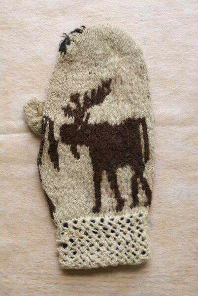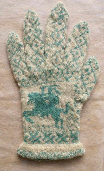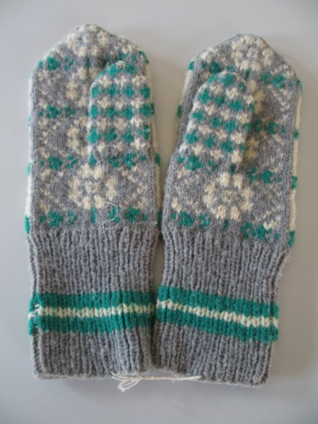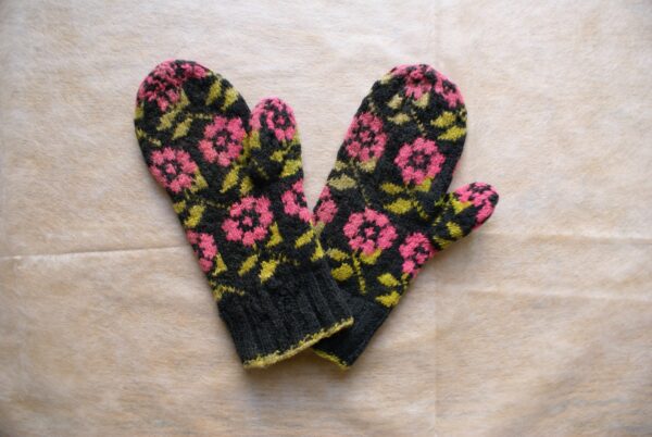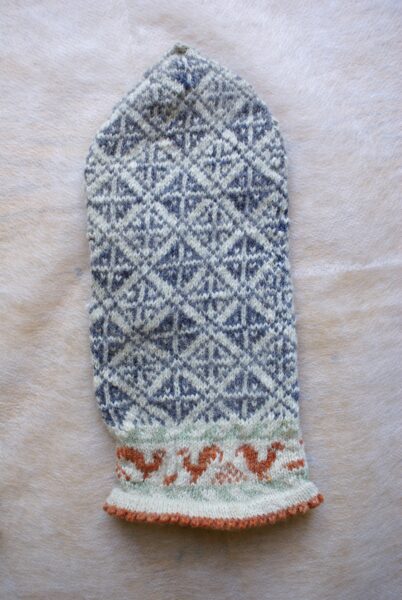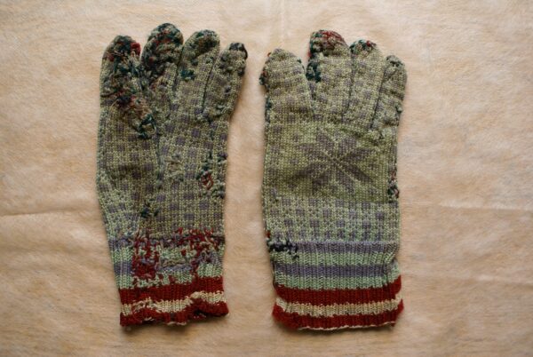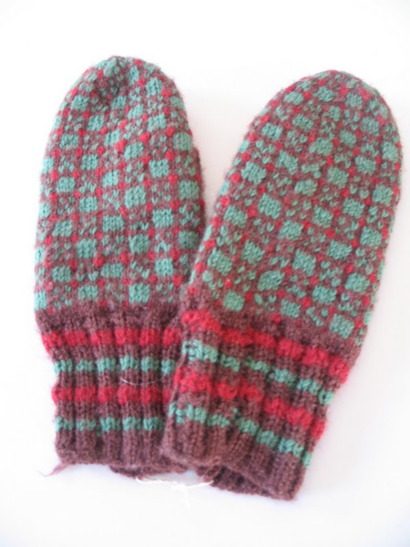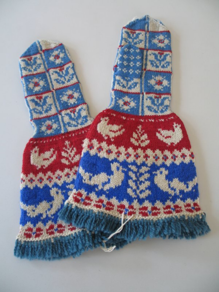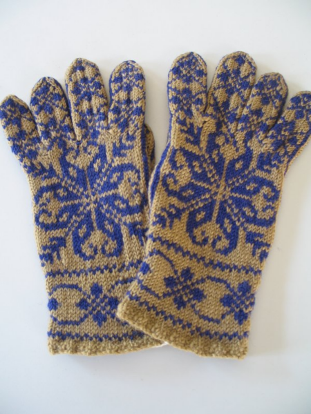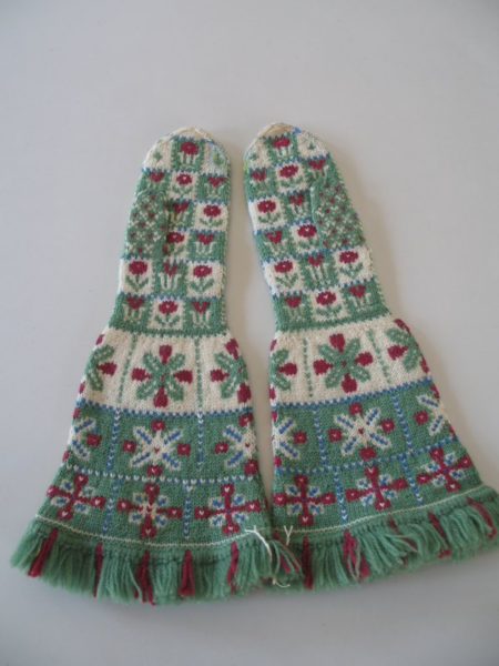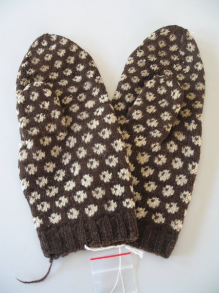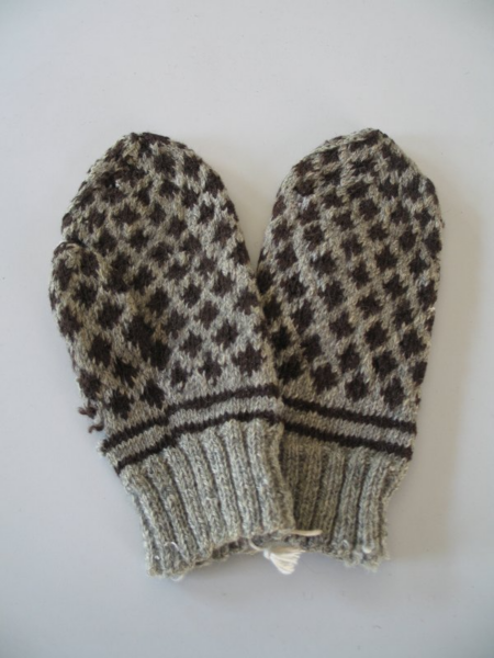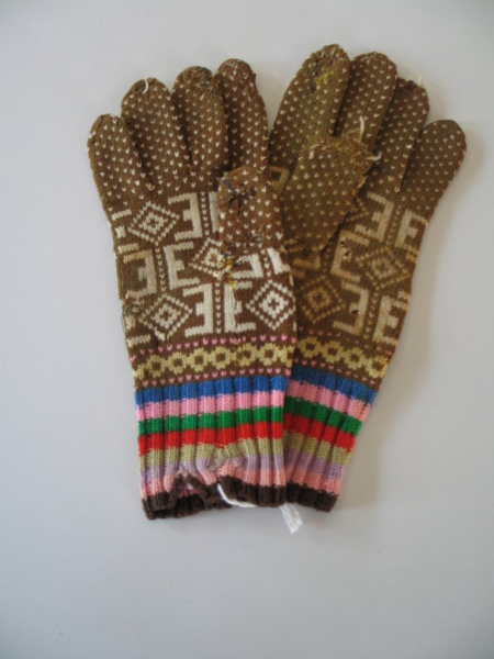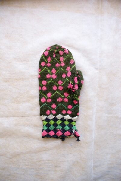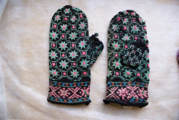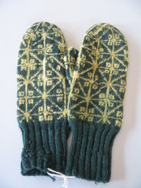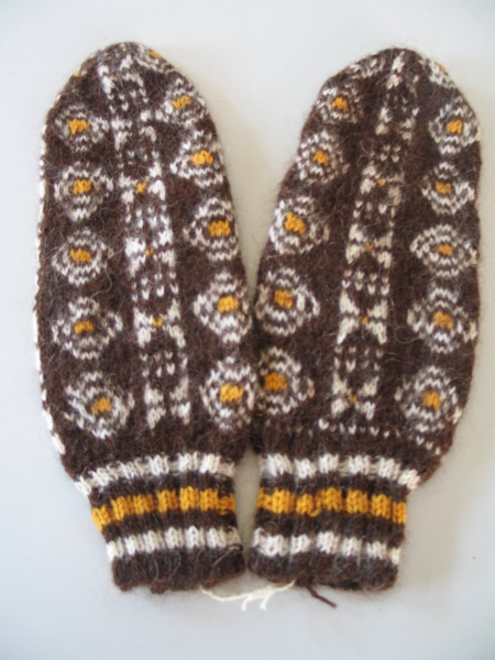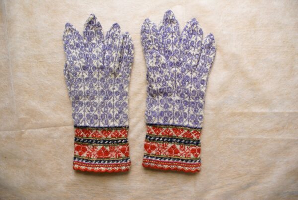 Most gloves and mittens were elaborately patterned, although only two, or at most three, motifs would be used on a single object. Sometimes the fingers and thumbs were solid-colored. The hand of a mitten or glove might be covered with many individual motifs arranged in horizontal, vertical, or diagonal bands, or might be decorated with an all-over, interlocking pattern. Individual motifs might also be surrounded by an interlocking lattice pattern.