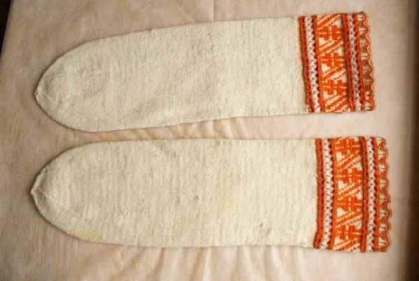 Socks were sometimes worked with all-over patterning, but just as often had patterned cuffs above plain legs and feet. For summer wear, socks were knit in lace or stockinette stitch out of undyed linen yarn, or with undyed and dyed linen in stripe patterns.