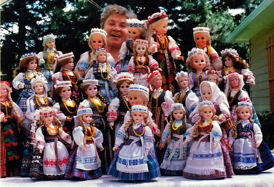 Lilė Nakrošienė with one of her specialty crafts – dolls wearing her hand-sewn national costumes, complete with amber beads and head-dresses. A collection of her dolls can be viewed at the Labdara Lithuanian Nursing Home in Toronto