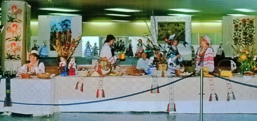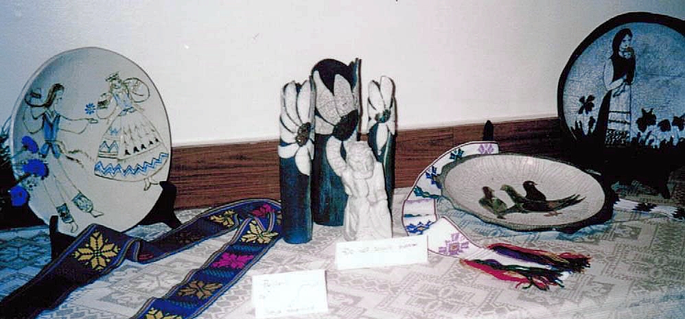Toronto LTFAI members at an exhibition displaying their handcrafted work: tapestries, Easter eggs, sashes and dolls